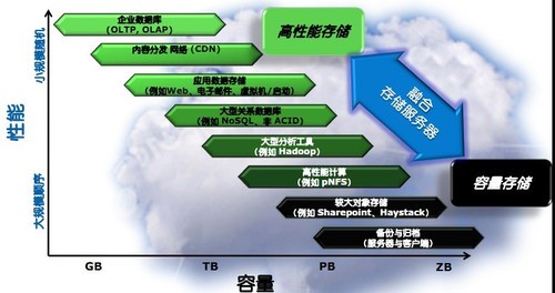 相对于结构化数据而言,文件归档和图片、视频等数据应用的非结构化数据和内容仓库,在实际应用中也更为普遍。另外,目前迁移到云平台的数据也主要是非结构化数据。这种以非结构化数据和内容仓库为主的高级数据应用特点,决定了云存储的目标要以这些高级、复杂的数据应用为重点,而这一目标又决定了云存储服务中的两种云架构体系:高性能存储和容量存储。