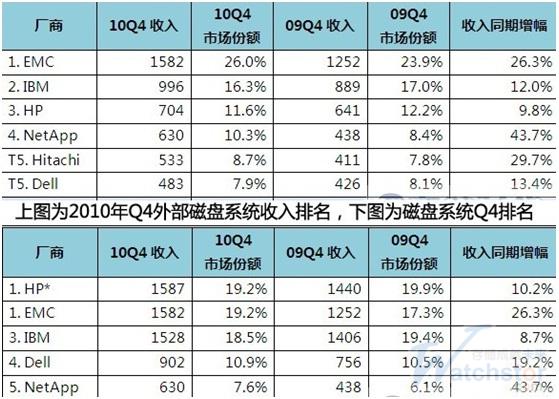 图一:2010年Q4,磁盘存储系统收入排名与外部磁盘系统收 入排名对比图。注:IDC《全球磁盘存储系统季度追踪报告》从2010年Q4开始,3PAR营收被纳入惠普所占市场份额。而戴尔在2010年Q4尚未完成 对Compellent的收购,所以Compellent的营收并未纳入戴尔所占市场份额。(本图片素材来着ZDnet)