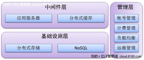 这套架构主要可分为四层,其中有三层是横向的,分别是显示层、中间件层和基础设施层,通过这三层技术能够提供非常丰富的云计算能力和友好的用户界 面,还有一层是纵向的,称为管理层,是为了更好地管理和维护横向的三层而存在的。接下来将一个个地给大家介绍每个层次的作用和属于这个层次的主要技术。