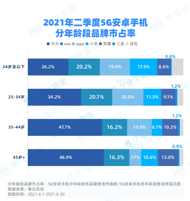每日互动通过大数据对不同年龄段用户5G安卓手机的激活使用情况进行洞察。数据显示,截至2021年二季度,华为5G手机依然是各年龄段用户的心头好,占比均排名第一;vivo在各年龄段占比排名第二,稳居行业第二大品牌位置;小米在各年龄段用户中的市占率均有所提升,较一季度有较明显增长。