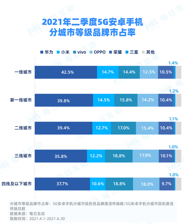 每日互动洞察了不同城市级别5G安卓手机的激活使用情况。数据显示,截至2021年二季度,华为5G手机仍处在领跑位置,其在一线城市的市占率最高,达42.5%;小米在一线城市持续进攻,市占率达14.7%,排名第二,赶超vivo。