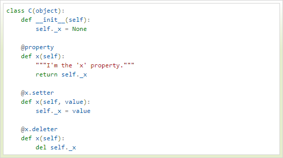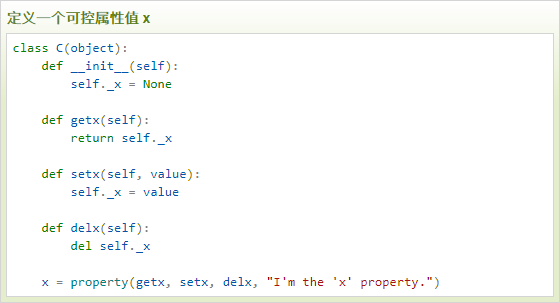 如果 c 是 C 的实例化, c.x 将触发 getter,c.x = value 将触发 setter , del c.x 触发 deleter。