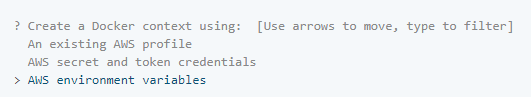 运行docker context create ecs myecscontext命令以创建名为 的 Amazon ECS Docker 上下文myecscontext。如果您已经安装并配置了 AWS CLI,则 setup 命令可以让您选择一个现有的 AWS 配置文件来连接到 Amazon。否则,您可以通过传递AWS 访问密钥 ID 和秘密访问密钥来创建新配置文件 。最后,您可以配置 ECS 上下文以通过AWS_*环境变量检索 AWS 凭证,这是与第三方工具和单点登录提供商集成的常用方法。