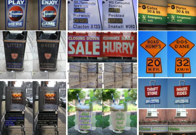 此外,你还可以用它替换不同场景中的文字(比如海报、垃圾桶、路标等)。下图中左侧为原始场景图像,单词显示在蓝色矩形中;右侧为文本替换后的图像。