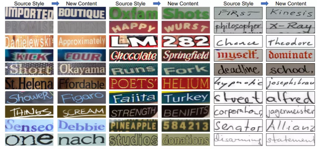 Facebook AI 提出了 TSB(TextStyleBrush)架构。该架构以自监督的方法进行训练,没有使用目标风格监督,只使用了原始风格图像。该框架可以自动地寻找图片真实风格。在训练时,它假设每个词框有真实值(出现在框中的文本);推理时,它采用单一源样式图像和新内容(字符串),并生成带有目标内容的源样式的新图像。