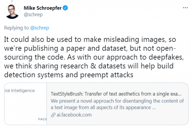 由于 TextStyleBrush 也可能被用来制作误导性的图像,所以 Facebook 的 CTO 在个人社交网站表示,他们只发布了论文和数据集,但没有公开代码。并表示正如我们对 deepfakes 的方法一样,我们认为共享研究和数据集将有助于构建检测系统并提前预防攻击。
