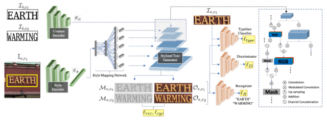 该研究还引入了一种新的自监督训练准则,该准则使用字体(typeface)分类器、文本识别器和对抗式鉴别器来保留源风格和目标内容。首先,研究者通过使用预训练的字体分类网络来评估生成器捕获输入文本风格的能力。另外,他们使用预训练文本识别网络来评估生成图像的内容,以反映生成器捕获目标内容的效果。总而言之,这种方法能够对训练进行有效的自监督。