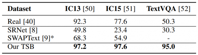表 3 是在三种数据集图像上测得的文本识别准确率。实验结果显示,TSB 的识别效果最好,在 IC13 上的识别准确率为 97.2%,IC15 上的识别准确率为 97.6%,TextVQA 上的识别准确率为 95.0%。