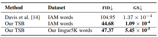 表 4 提供了生成的手写文本的定量比较,将 TSB 方法与 Davis 等人 [14] 专门为生成手写文本而设计的 SotA 方法进行了比较。FID 分数越低,生成质量越好。显然,TSB 方法优于以前的工作。