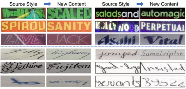 从图中可以看出,各种风格的字体 AI 几乎都能 hold 住。下图中每个图像对在左边显示输入源样式,在右边显示新内容(字符串),左右两端字体看起来风格完全相同。与源图像相比,输出的图像在外观上似乎都有些模糊,但我们可以看到,在大多数情况下,该技术似乎工作得很好。