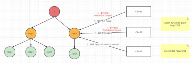 2、当 Client3 修改 /app2 的值后,Zookeeper 会主动通知 Client1 和 Client2 ,并且回调监听器的方法