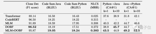 结果在代码抄袭检测、总结代码生成文档、和自然语言搜索代码片段这3个任务上,使用DOBF或MLM+DOBF预训练都取得了更好的成绩。