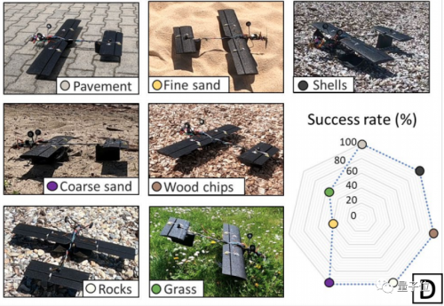 从路面类型来看,这个无人机在人行道、碎石路面、洒满木屑的地面等5种地形上都能达到100%成功翻身的效果。