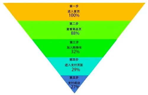 因此,当我们分析用户从进入产品到完成消费的过程时,可以大体分为如下几个关键步骤:进入首页、查看商品页、加入购物车、进入支付页面、成功支付。通过分析每个阶段的转化率和流失率,能够直观地发现很多问题,进而找到提升KPI的方法。