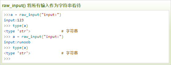 raw_input() 将所有输入作为字符串看待,返回字符串类型。