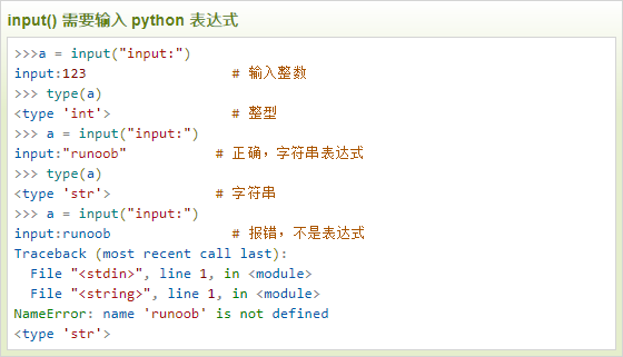 注意:input() 和 raw_input() 这两个函数均能接收 字符串 ,但 raw_input() 直接读取控制台的输入(任何类型的输入它都可以接收)。而对于 input() ,它希望能够读取一个合法的 python 表达式,即你输入字符串的时候必须使用引号将它括起来,否则它会引发一个 SyntaxError 。