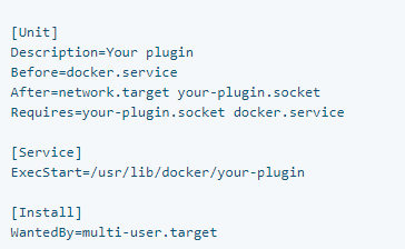 插件应该在 Docker 之前启动,在 Docker 之后停止。例如,在为支持 的平台打包插件时systemd,您可能会使用systemd依赖项来管理启动和关闭顺序。