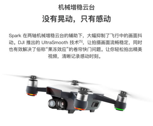 小身型,大身手。障碍感知结合机器视觉,操控易如反掌。机械云台配以 UltraSmooth,航拍稳定流畅。最高时速 50 公里1,2 公里高清图传2,手掌大小的 “晓” Spark,让你尽享飞行乐趣。