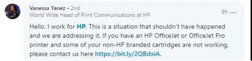 惠普的官方工作人员Ray Stasieczko在领英上留下动态评论,表示此次固件升级本不应该影响兼容墨盒在打印机使用,并建议受影响的用户联系惠普客服。