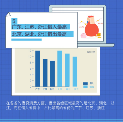 而在各省的借贷消费方面。借出省级区域最高的是北京、湖北、浙江,而在借入省份中,占比最高的省份为广东、江苏、浙江。而这其中还有一个有趣的现象,那就是在跨省自己出借方面,不少湖北人的钱借出给了广东人,而很多人上海人的钱则借给了浙江人。