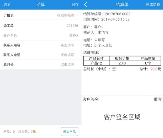 服务结束后进行结算,现场云App中,工程师现场服务可以工时结算,也可以安装维修等项目进行结算收费。销售易销售云中的产品价格列表集成在现场云中,工程师可将服务与配件的标准价格表出示给客户,价格透明,消灭乱收费、乱加项目、乱换零件等安装售后恶劣现象。