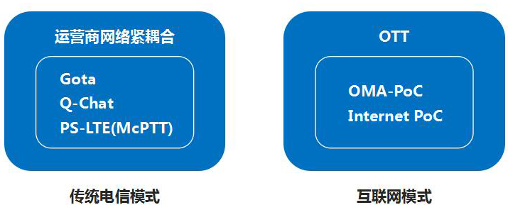 由于语音对讲业务在行业指挥调度通信中具有重要地位,在以电话业务为主的电信时代,市场分析认为组群对讲业务的市场需求可占到整个话音通信市场的十分之一。因此,电信运营商及相关通信标准组织一直在探索基于公众移动通信网络提供组群对讲业务的能力,从2G时代,一直延续到3G、4G和移动互联网时代,并产生了多种技术体制。概括起来,可以区分为两大类,一是基于传统电信运营商思维,与电信运营商网络紧耦合的技术体制,如Gota、Q-Chat、PS-LTE;另一类是基于互联网思维,采用OTT技术,与电信运营商的网络松耦合,如OMA PoC、Internet PoC。