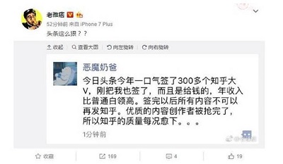 2017年8月,字节跳动旗下悟空问答挖走知乎300大V,并要求签约作者的内容不能再发知乎,致使知乎多年来维护的“内容高地”被破坏,即便现今知乎上依然聚集着大量高质量内容创作和消费者,但悟空问答这种“资本扫荡式”的破坏力也让不少知识分子唏嘘不已。