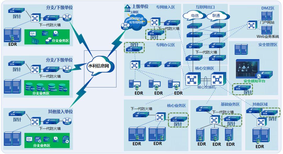 在水行政主管部门部署安全感知平台,并将流量探针针对性地部署在内网各业务域以及下属分支机构或下级单位,收集网络安全流量数据,通过水利信息网汇总到安全感知平台集中分析展示。还可以联动用户已有安全设备,比如联动下一代防火墙实现一键阻断,自动阻断木马与黑客通信,联动终端检测响应平台EDR软件,从端点执行扫描、查杀等动作。