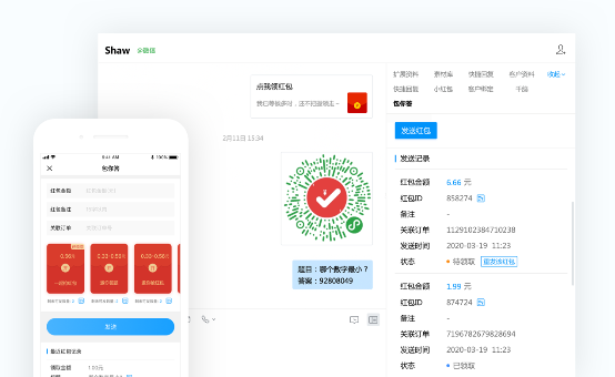 向客户派发红包,是企业运营的刚需,能够刺激消费,拉近客户感情,增强互动,维护品牌的忠诚度。举个简单的例子,当客户、经销商的订单达到一定量的时候,很多企业会将利润的一部分作为奖励发放给消费者,这个时候,如果企业微信后台管理能够看到订单并向客户及时发红包奖励,则能够省时省力且有效维护客户。而虎赞SCRM正是实现了这一需求。