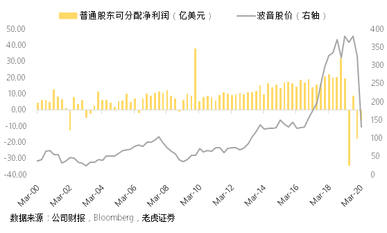 一季度波音亏损6.4亿美元,继续受到737停产和疫情的影响。波音在2000年后均保持着持续的净利润,作为工业股,波音不太具备明显的营收扩张、收缩周期,盈利是推动波音股价上行的主要因素。老虎证券投研团队看历史上,波音股价几次重要的调整也发生在净利润收缩的时期。