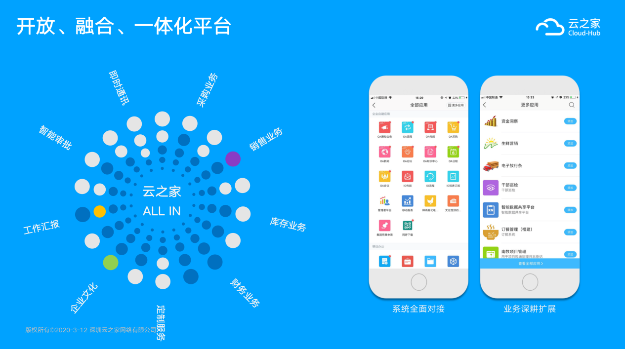 周毅介绍,云之家作为新一代智能协同云,与ERP无缝连接并深度融合,实现企业的人、财、物、产、供、销多业务的高效实时协作,提供高定制化的轻应用开发,打破线上线下协同壁垒,通过及时沟通、流程化、一体化专业协作,满足客户的灵活办公需求。