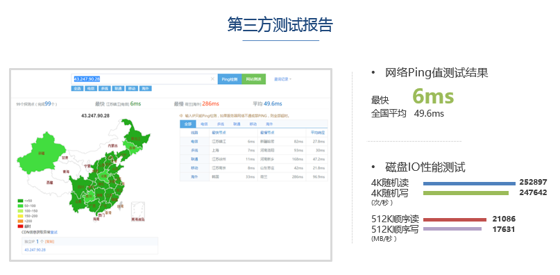 从全国网络质量上看全国的最快访问已经低至6ms,全国平均访问延迟也在50ms以下: