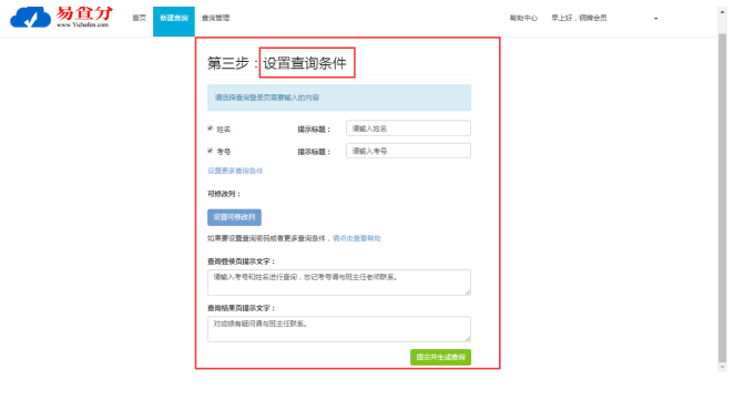 这里设置的查询条件可以自己选择,比如“姓名”和“学号”,这样学生家长或学生在易查分在线成绩发布系统里面查成绩的时候就可以输入自己的姓名和学号来查自己的成绩了