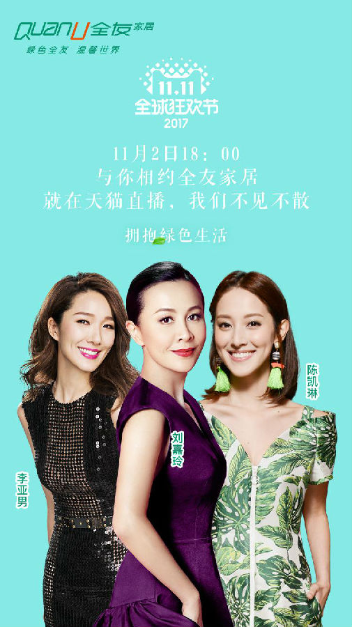11月2日,刘嘉玲、李亚男、陈凯琳三大女神首次合体,同台亮相2017全友家居双十一“拥抱绿色生活”天猫直播间,为绿色生活代言。现场女神们将分享自己爱情保鲜方法与生活趣事!