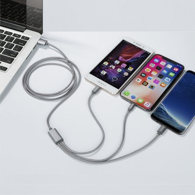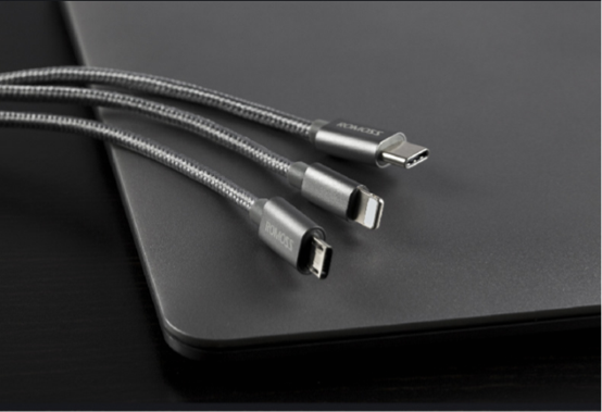 罗马仕一拖三数据线,三个接头整合的设计,使其最多可同时为三台不同的电子设备进行充电,在只使用一个接头时甚至能达到2.1A的电流输出,充电稳定而快速,日常出门,只需要携带这样一条数据线就足以满足不同设备的续航问题。