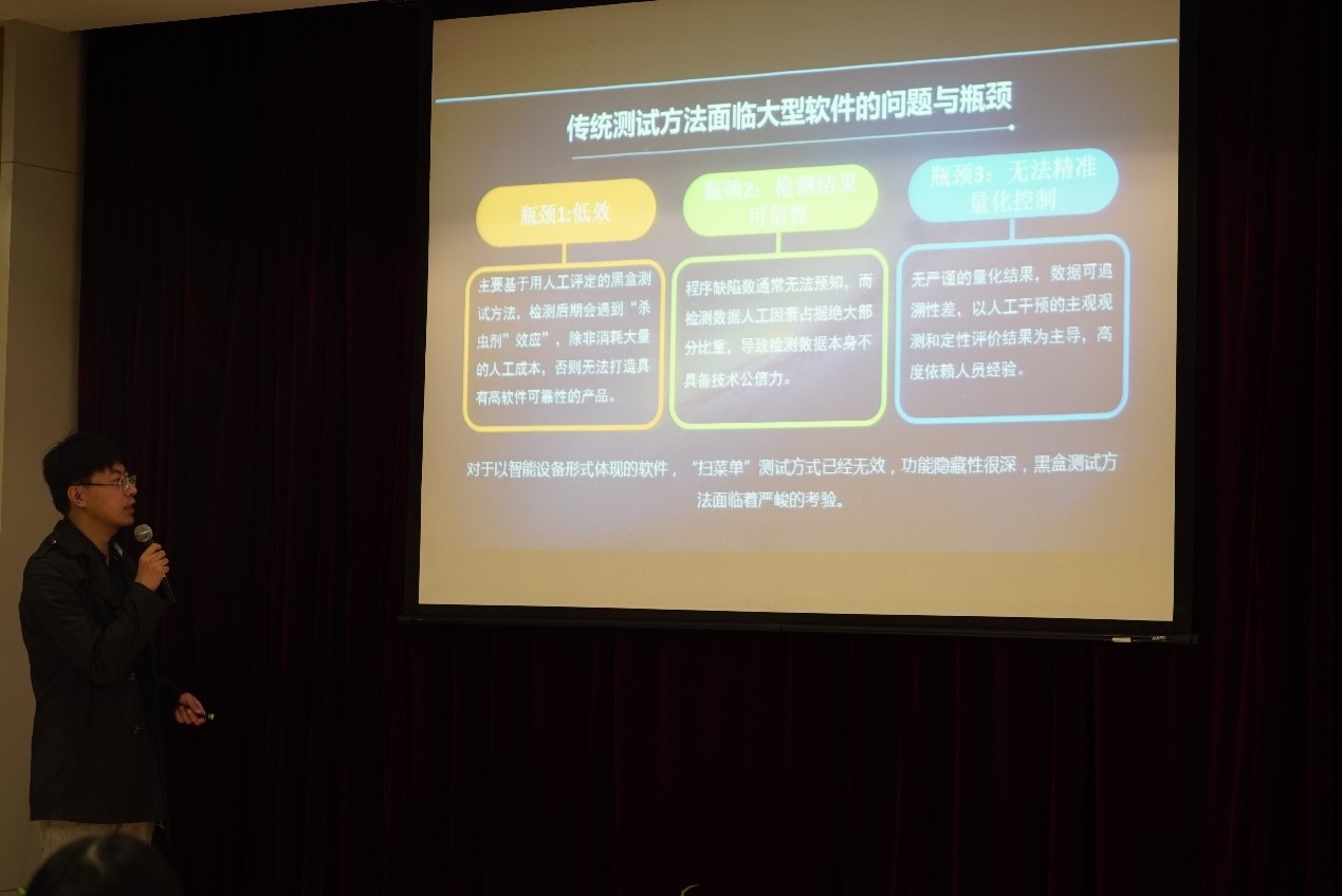 “星云测试”创始人兼星云平台设计师赵明先生首先向师生们介绍了“面向大型高复杂度软件的工业级精准测试技术”。由星云测试引领并倡导的前沿技术“精准测试”,获得如金融、军工、智能工业、电信运营商等众多超大型客户的认可,并取得了很多重大创新成果。星云测试系列产品炫酷的测试元数据多向可追溯化、可视化、智能化等多种具有创新突破的技术特性,引起了在场师生的巨大反响和热烈鼓掌。