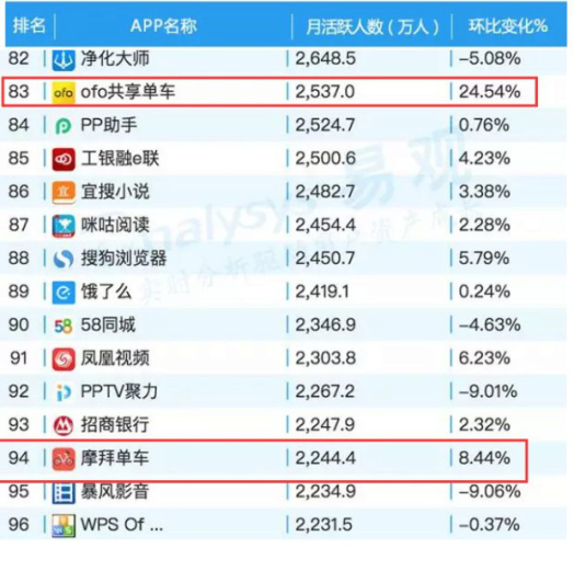 在用户增速方面,易观通过数据分析称,ofo在5月全面超越了摩拜单车,并以2537万月活用户规模上升20位,位列第83名,居行业第一位,领先排名第94位摩拜单车11个位次。另外,在易观TOP90排行榜上,只有ofo实现了两位数的环比增长率,且ofo以24.54%的环比增速领先摩拜单车16.1个百分点,成共享单车行业活跃用户规模和用户增速的第一平台。