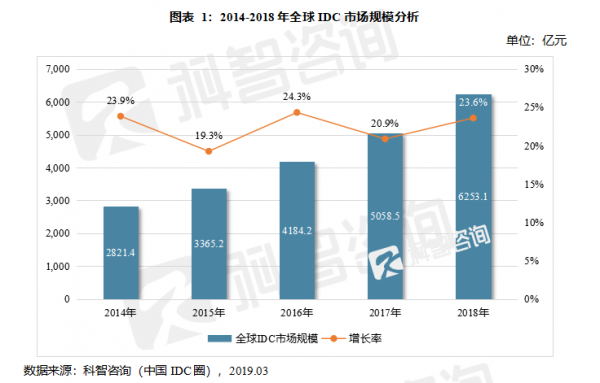 2018年全球IDC市场保持高速增长,规模达6253.1亿元人民币