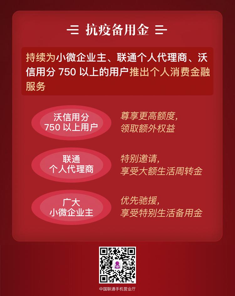 此外,据相关负责人介绍,凡中国联通沃信用分在750分以上,且过往信用记录良好的小微企业主,均可通过招联金融,获得额度更好、利率更优的特别备用金,用于维系家庭基本开支,共克时艰。