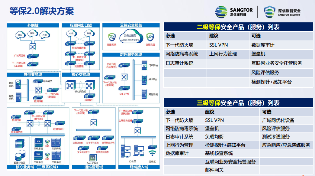 以老牌安全厂商深信服为例,基于运营、使用单位在等保建设中的实际需求,为了帮助更多的运营、使用单位尽快满足等保2.0时代的合规要求,深信服推出了等级保护2.0解决方案。该方案是以国家等级保护安全框架为依据,通过提供专业的等保全流程服务,帮助用户在充分满足国家法律法规和标准体系的前提下,构建主动防御体系,为用户业务系统带来“持续保护”的价值。