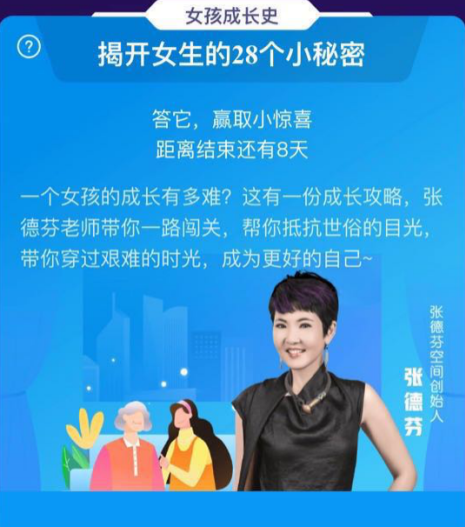疫情当前,张德芬空间充分借助“互联网+教育”的优势,前后推出了一系列的“抗击疫情”的线上成长教育直播课,辅导全民如何理性认识和面对疫情,全方位守护国民的心理健康和个人成长。此次,又联合支付宝答答星球针对女性群体,共同发起了“揭开女生的28个小秘密”专场答题。不论是你遇到青春期的困惑,亦或是职场遇到的小挫折,还是亲密关系的修复,那些你遇到的难题,都可以在这里解惑。