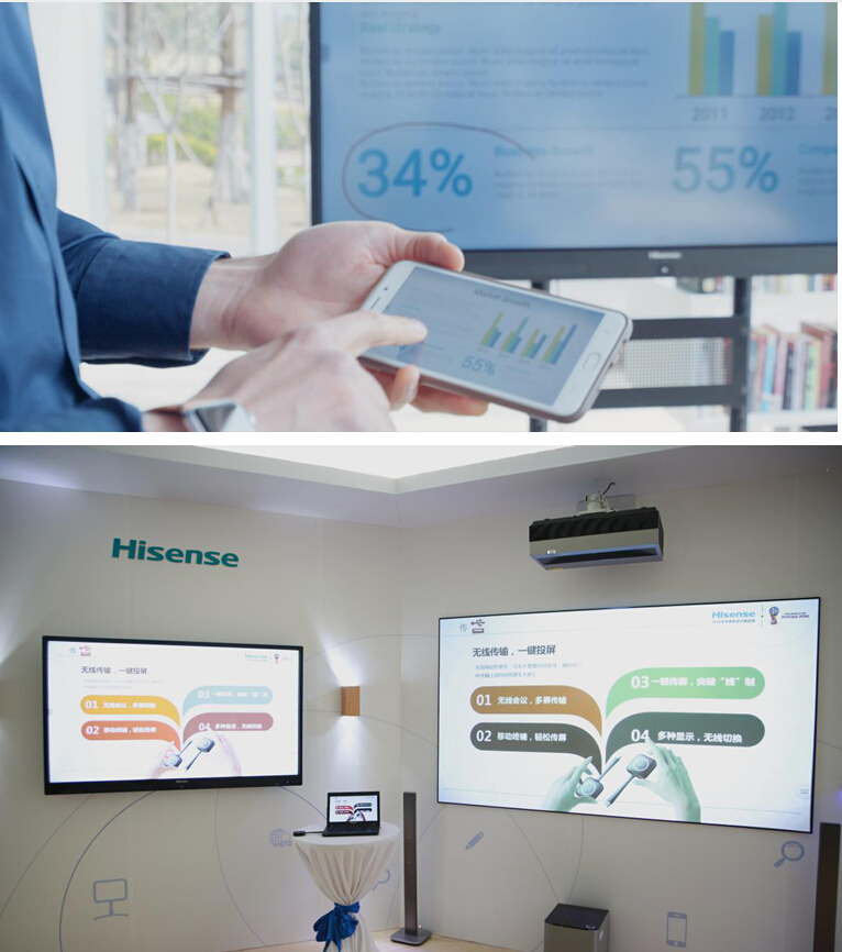 在中小型会议生态中,海信推出了会议“神器”—海信智能会议平板与海信传屏宝。开会时,任何人都可以轻松地将任意笔记本画面的内容一键投到大屏上,智能会议平板的任意写、画、存、传、享,彻底摆脱了以往会议室布线的困扰;在大中型会议生态中,海信匠心独运地将海信百寸超短焦激光与智能会议平板无线相连,实现了“多屏多显”,“多屏同显”等多种显示方式,适应企事业单位的会议需要;在超大型会议生态中,在满足基本会议需要的基础上,搭配智能会议平板,海信又为超大型的会议提供了适合多人观看的海信大型拼接墙,完全打破了以往单一屏观看面积、清晰度以及灵活性的条件局限。