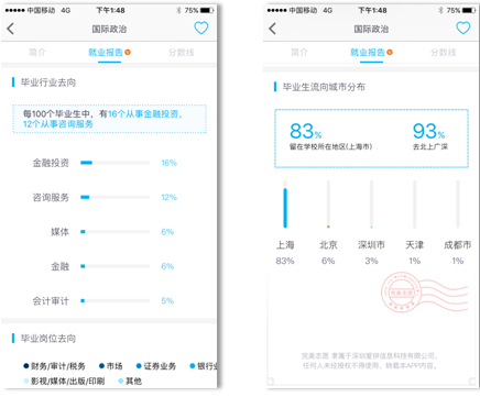 第二步,你需要根据生涯规划以及每个学校各个专业的就业去向,选择学校和专业,否则再好的生涯规划也无法实现。可惜即便是大学老师也不清楚毕业生的详细就业和发展情况,更不用说其他专家了。iPIN当时就是为了做到这一点,才创建了中国历史上第一个高校就业大数据库,覆盖2500多所高校10万多个院系的详细就业情况,甚至可以具体到蓝翔技校挖掘机专业的就业详情。比如外交学院就业非常好,中华女子学院也招收男生,复旦的国际政治专业毕业生非常受世界一流投资银行欢迎等这些事实,都是我们通过海量数据分析出来的。这是人靠经验根本做不到的。去年我参加了北京一家知名机构举办的高考志愿填报咨询会,在现场,我难以置信地听着专家在跟大家推荐说电力专业的就业前景好。要知道西安交大曾经的王牌专业电力电气,其毕业生的职业发展前景其实都很一般。但专家们将自己道听途说的经验传授给各位家长,即便是再聪明的人,脱离了真实的就业数据,也不可能做好一份优秀的志愿填报方案来。