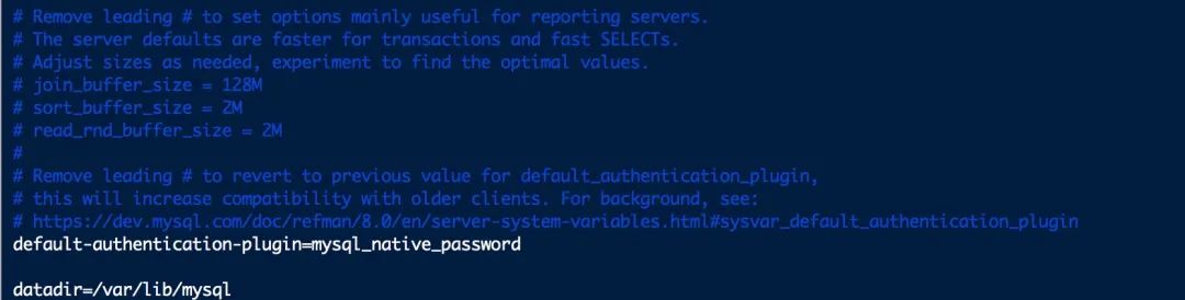 找到mysql的配置文件vim /etc/my.cnf,把密码的加密方式改成之前版本的,8.0版本更换了密码的加密方式,我们就先用旧的。
