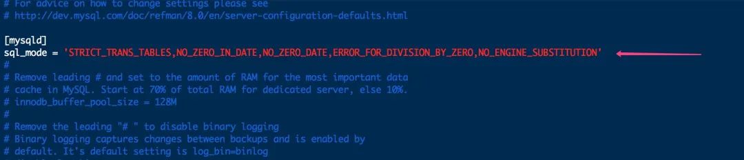 #vim /etc/my.cnf sql_mode='STRICT_TRANS_TABLES,NO_ZERO_IN_DATE,NO_ZERO_DATE,ERROR_FOR_DIVISION_BY_ZERO,NO_ENGINE_SUBSTITUTION' #重启服务 systemctl restart mysqld
