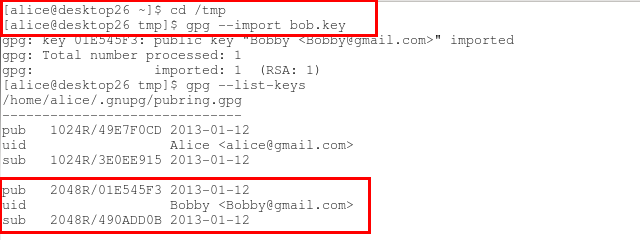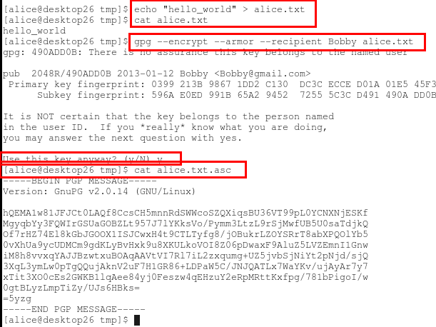 5、 切换到用户alice然后导入bob的公钥并对文件进行加密