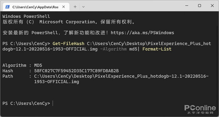 Get-FileHash <文件路径> -Algorithm| Format-List. 文件路径>