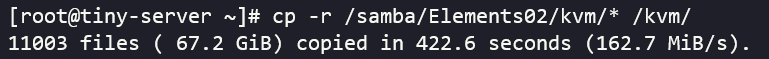 $ cp -r /samba/Elements02/kvm/* /kvm/ 0 files copied so far... 1.6 GiB / 67.2 GiB [===> ] 2.4 % Copying at 178.4 MiB/s (about 0h 6m 45s remaining) /samba/Elements02/kvm/iso/CentOS-6.10-x86_64-bin-DVD1.iso 1.6 GiB / 3.7 GiB [========================================================================>