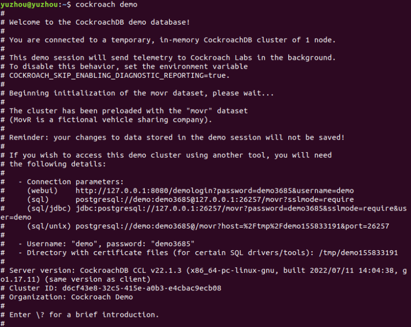 启动使用启动临时本地内存集群,使用cockroach demo 命令: