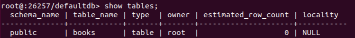 此时,运行 cockcoach sql 进入数据库命令行,然后运行 show tables; 命令,可以看到在默认数据库 defaultdb 中已经生成一个 books 数据库表(与我们的模型 books 同名),如下所示: